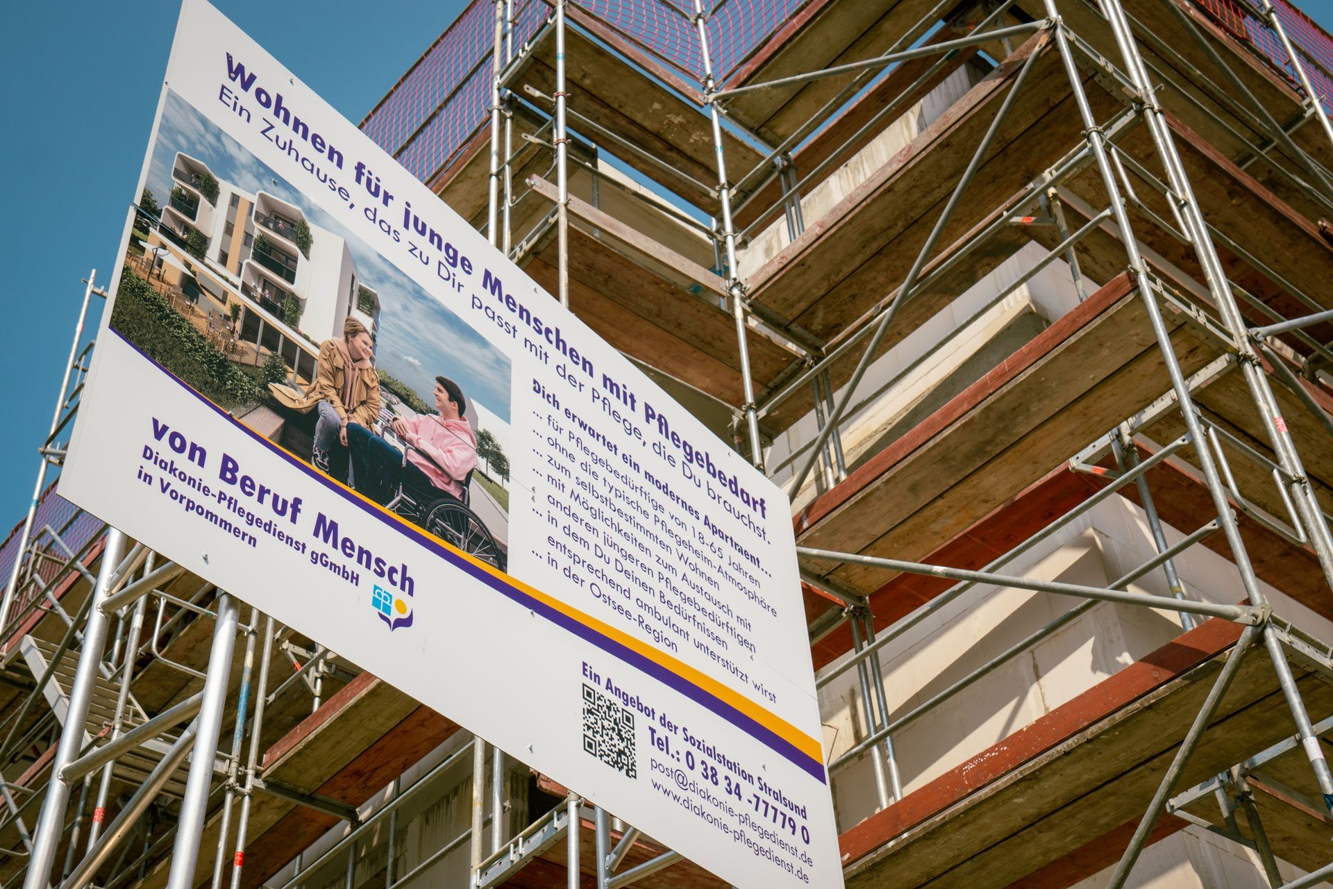 In der Heinrich-Mann-Straße entsteht derzeit ein vierstöckiges, modernes Gebäude. Ab August 2025 sollen hier junge Menschen mit Pflegebedarf ein neues Zuhause finden. Jetzt noch schnell eine der letzten freien Wohnungen von unserer "Jungen Pflege am Sund" sichern!