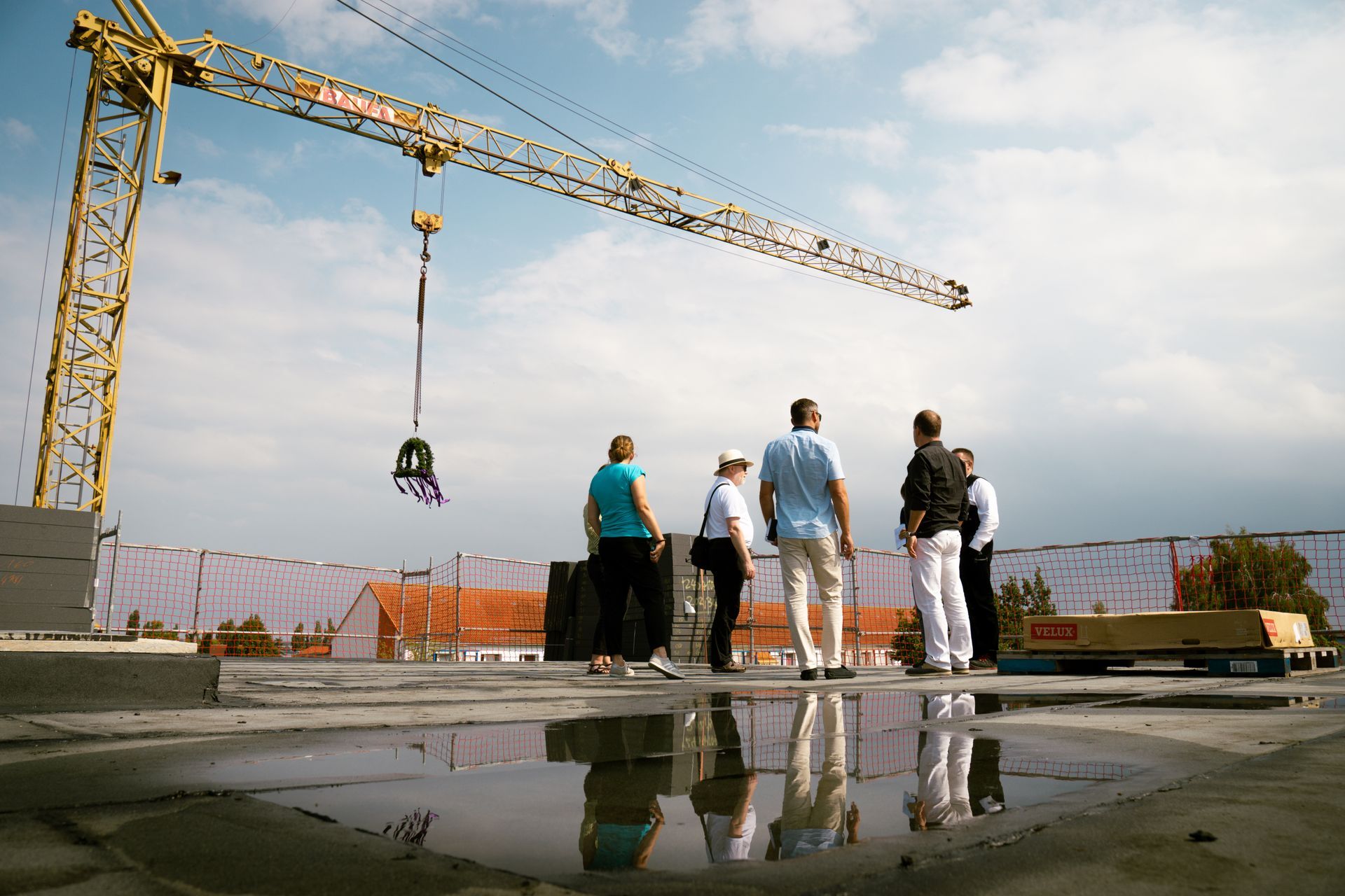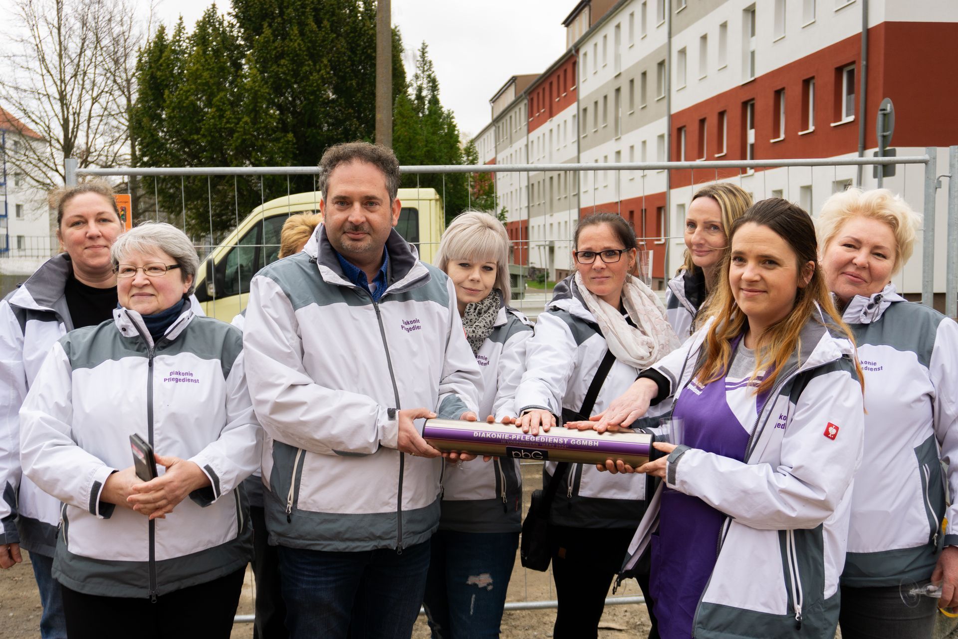 Im Sommer war es an der Zeit, einen weiteren Meilenstein zu feiern: Wir luden zum Richtfest ein. Dazu durften wir Vertreter der Gewerke, Kolleginnen und Kollegen aus unserem Team und weitere Unterstützer ein. Gemeinsam mit Architekt Frank Bräsel konnten Interessierte die Baufortschritte der Sozialstation im Erdgeschoss sowie der barrierefreien Appartements besichtigen und sich für das Projekt „Junge Pflege“ begeistern lassen.